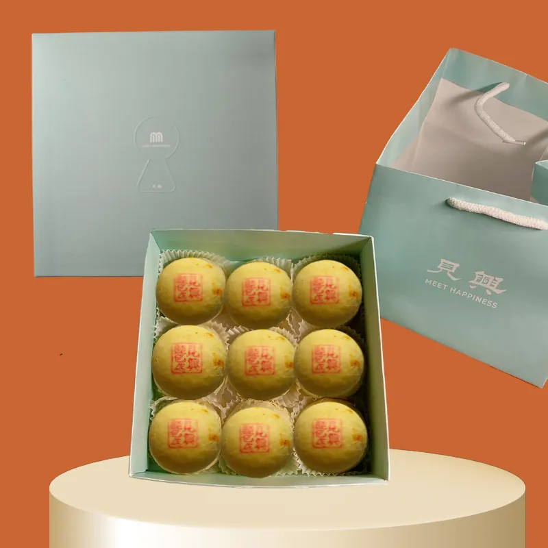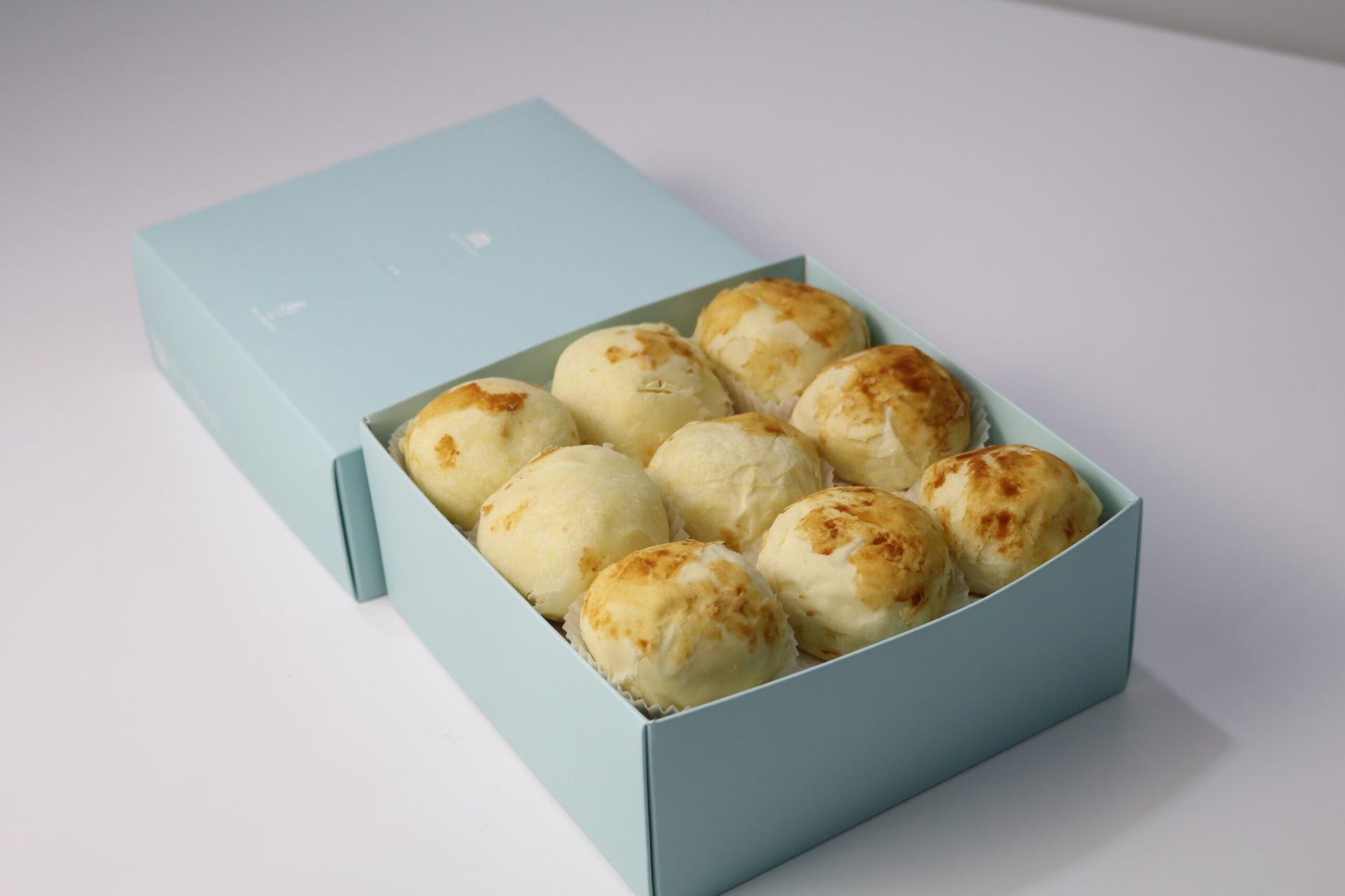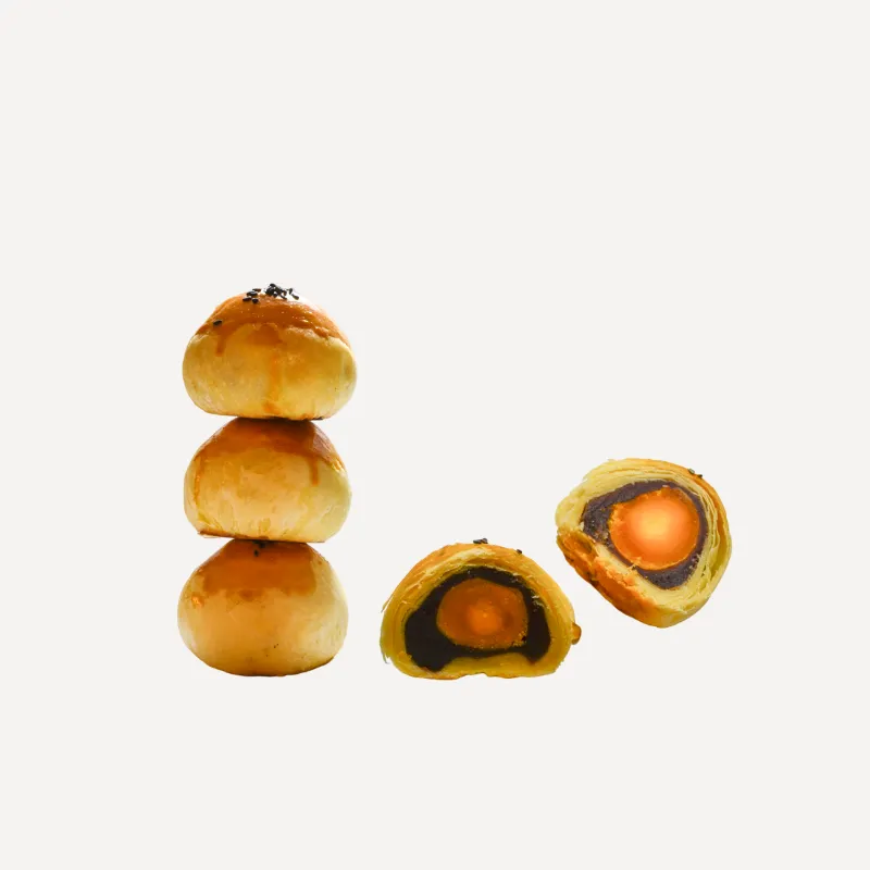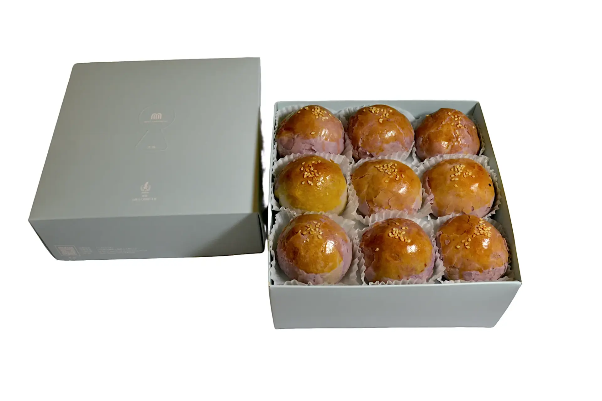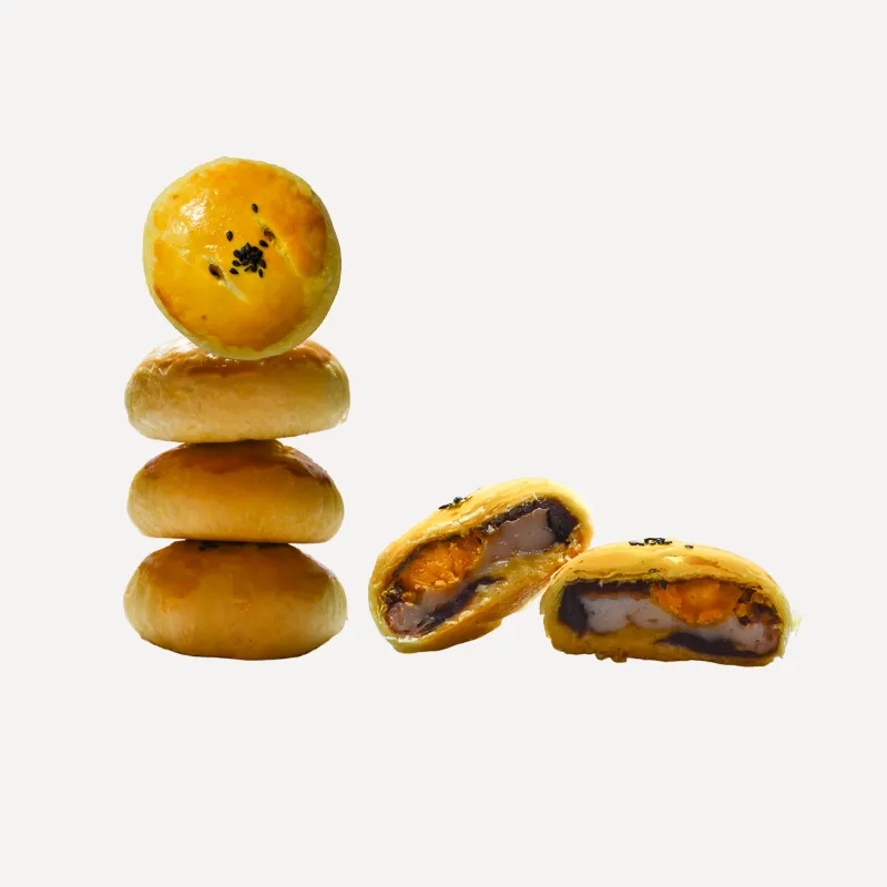 最後壓軸的是【芋見泥蛋黃酥】。市面上少見的芋頭蛋黃酥口味,外皮金黃酥鬆,內餡低糖芋泥香氣純粹,搭配完整鹹蛋黃,鹹甜比例拿捏得恰到好處。它既保留了蛋黃酥的傳統精神,又融入芋頭的清甜,成為創新與經典並存的代表之作。